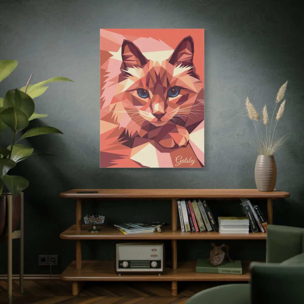 Gatsby's electric blue eyes brilliantly convey his cool, commanding spirit. The low-poly structure uniquely frames his distinctive grace, truly capturing the elegant soul of a magnificent feline. His personality shines through every angle.