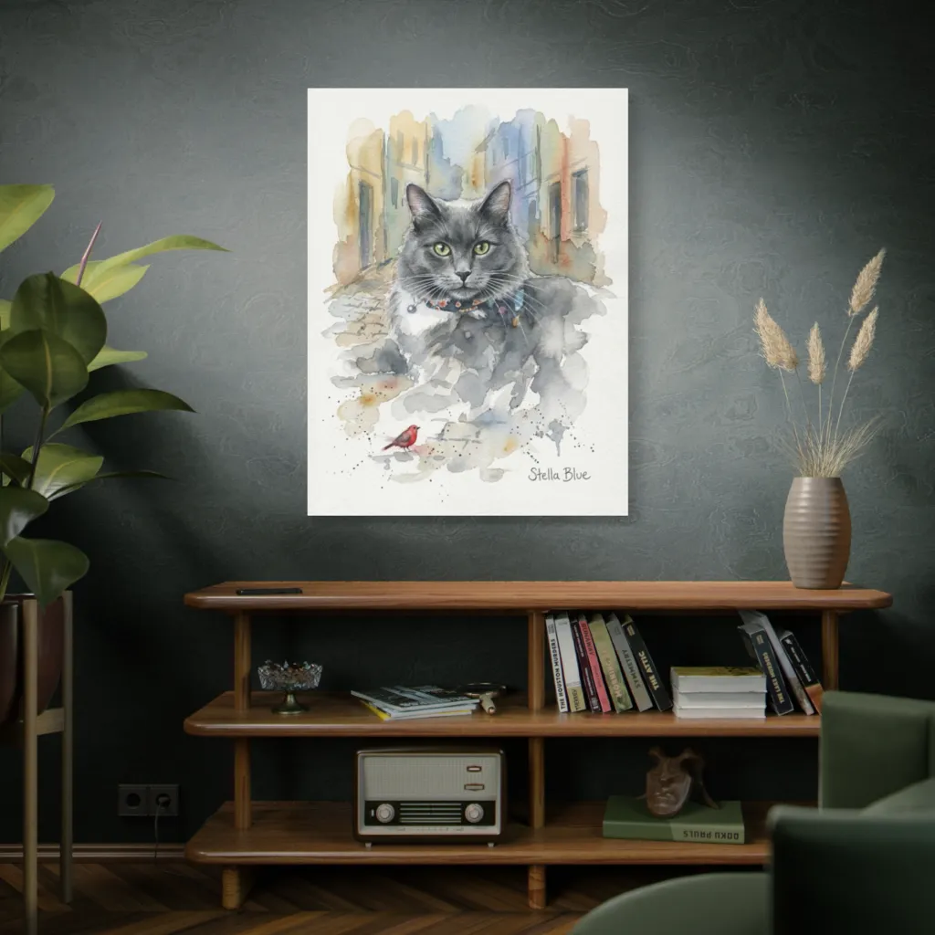 "Gaze of Stella Blue" demands a sun-drenched reading nook. Pair this whimsical watercolor above a raw oak console, accented with brushed brass. Its emerald eyes will captivate, adding chic warmth to your curated abode.