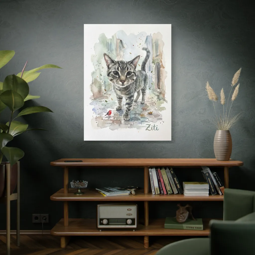 A charming watercolor captures a wide-eyed tabby cat strolling a soft, cobblestone street, exuding whimsical curiosity. This Ziti looks ready to noodle around town, no al dente attitude required.