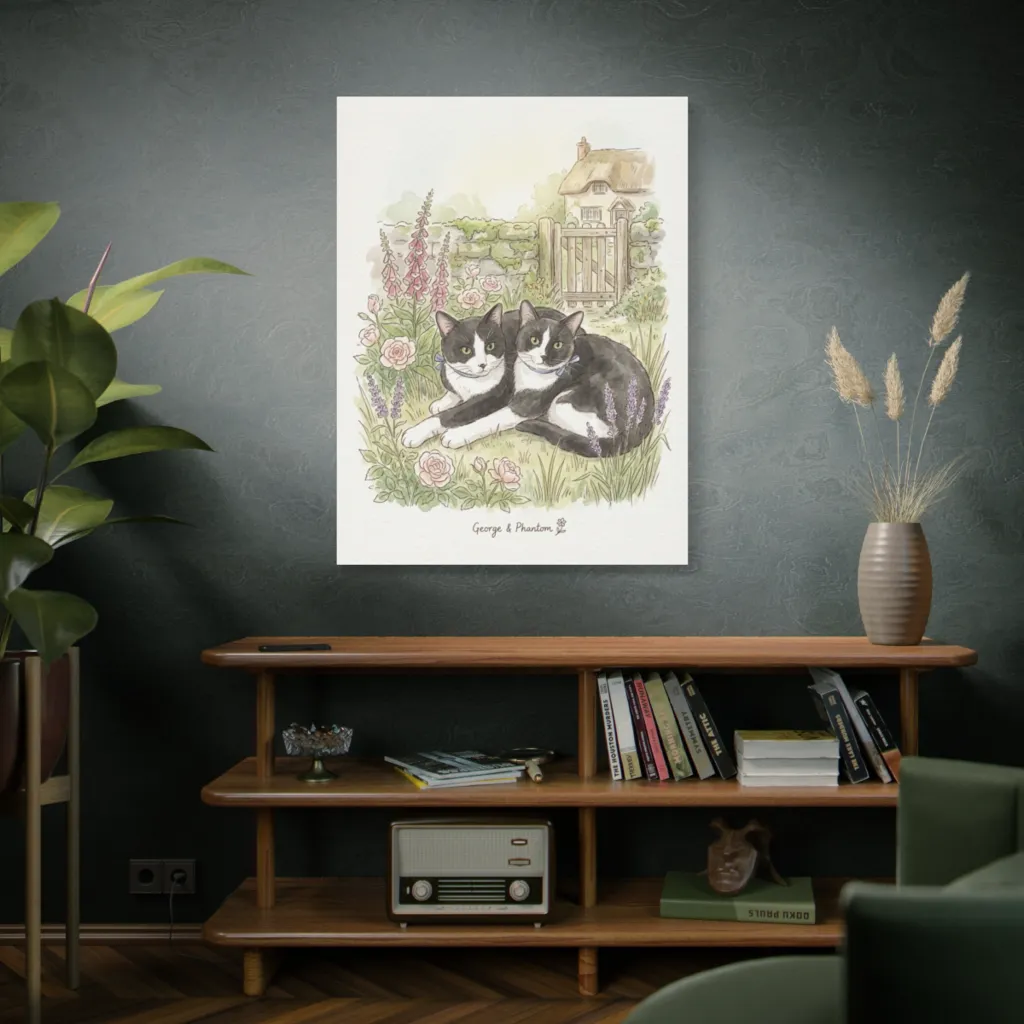 This charming watercolor captures two dapper cats lounging serenely in an idyllic cottage garden, evoking whimsical tranquility.