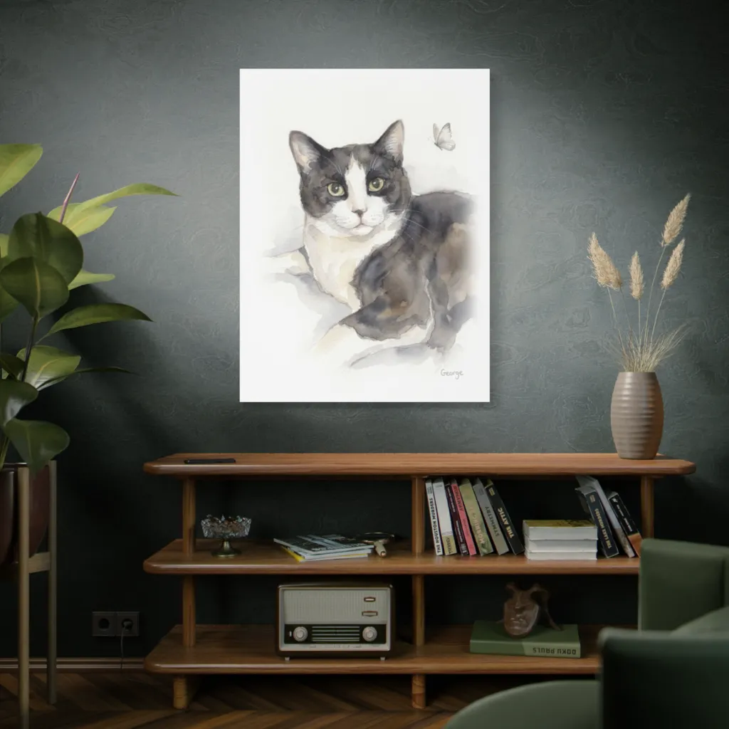 The dreamy watercolor expertly balances cool grays and blues with a whimsical butterfly's warm pop, creating chromatic harmony. Saturation is perfectly controlled, enhancing George's serene elegance and quiet energy. Brilliant!