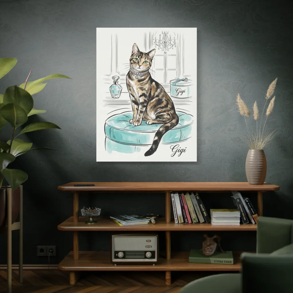 This chic ink-and-watercolor captures a bejeweled tabby radiating pampered, regal charm. Gigi, draped in diamonds on her aqua ottoman, clearly expects only the finest things in life.