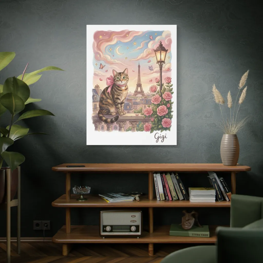 A whimsical watercolor paints a charming tabby perched above Parisian rooftops under a dreamy, star-kissed sky. Gigi, with her Parisian chic, certainly knows how to make a charming entrance on this romantic balcony.