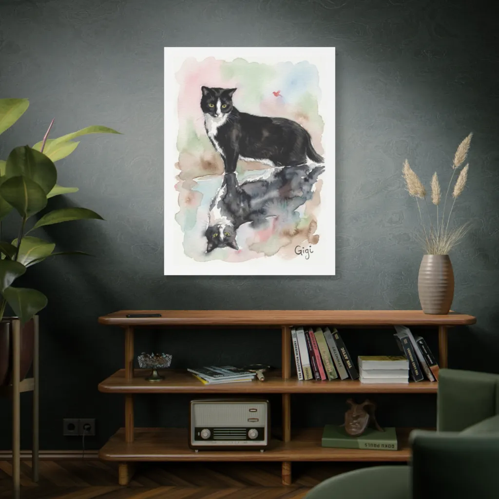 Fluid watercolors portray a poised tuxedo cat contemplating its watery reflection, creating a dreamy and quietly curious ambiance. Gigi's signature completes this charming duality, making us wonder which cat gets double the treats.