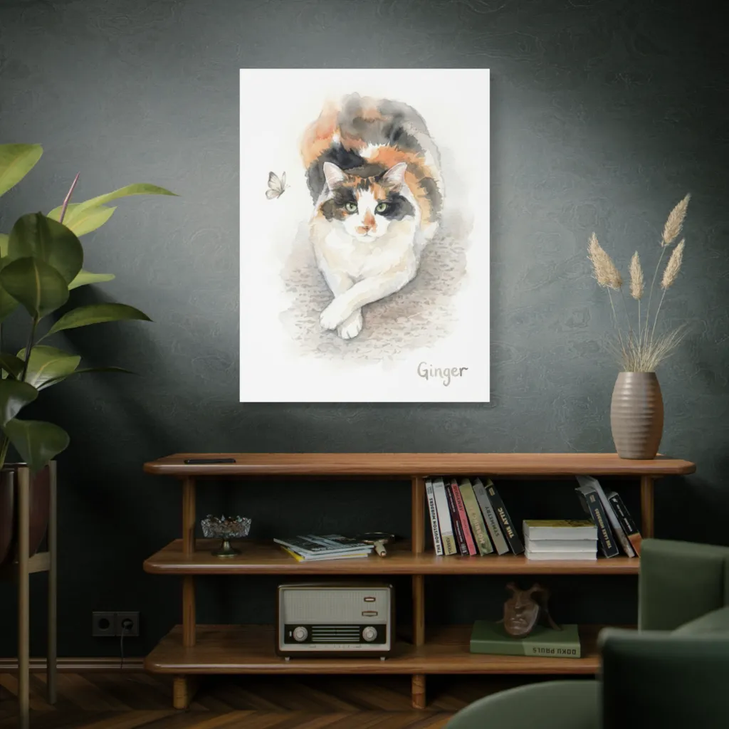 A delightful watercolor captures a regal calico cat, with poised paws and piercing green eyes, contemplating a fragile butterfly. Ginger's serene pose perfectly belies her inner feline calculation about that tempting butterfly.
