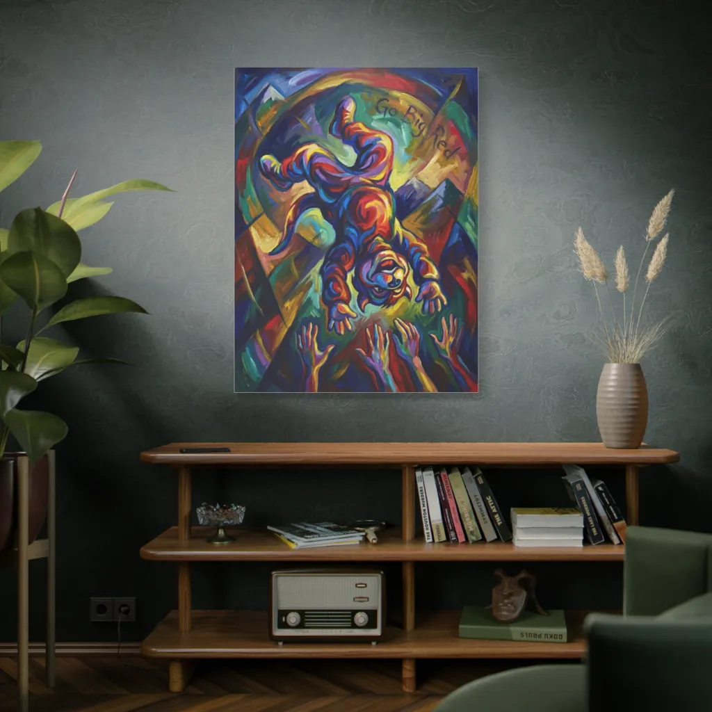 Go Big Red's buoyant dive beautifully captures his mascot spirit and hopeful zeal. The cubist forms reveal his electric energy and unique, joyful abandon. Truly special.