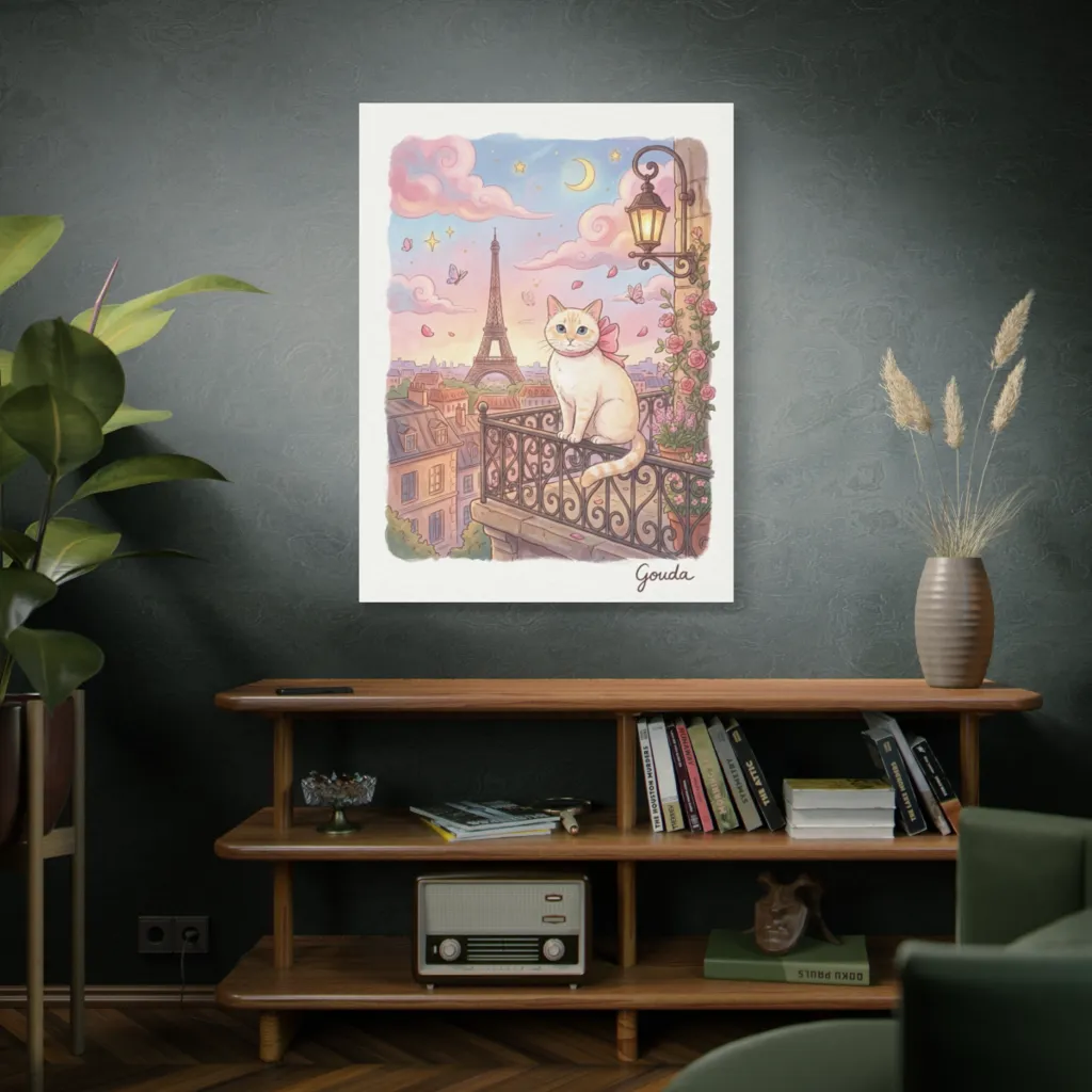 Pastel watercolors depict a charming cat on a romantic Parisian balcony with the Eiffel Tower, casting a whimsical and serene spell. Gouda, the feline connoisseur, finds this purr-fectly picturesque Parisian balcony quite the Gouda-licious view.