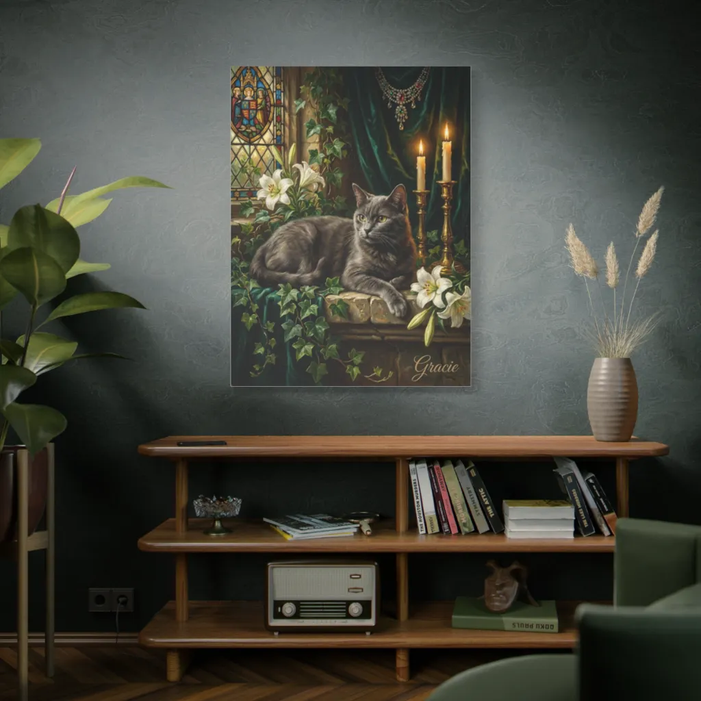 "Gracie's Enduring Grace" masterfully juxtaposes gothic gravitas with feline indifference. Tonal harmony and visceral brushwork create an avant-garde serenity. A monumental contemplation of existential cat-ness.