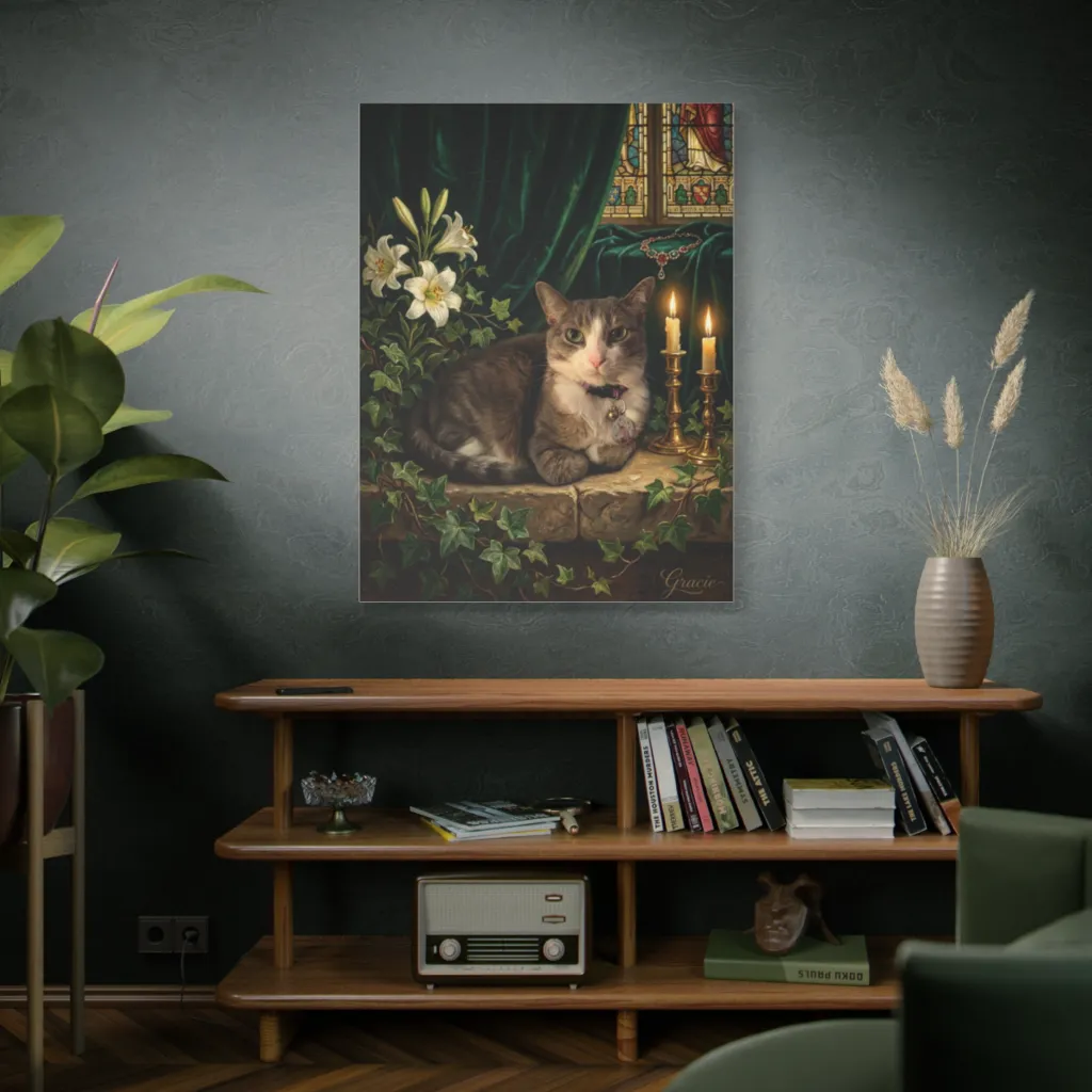 “Gracie's Verdant Vigil” belongs above an antique mahogany sideboard. Pair with rich jewel-toned velvet and brushed brass lighting for an utterly chic, sophisticated statement.