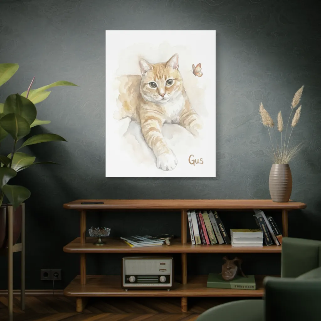 This piece innovatively blends traditional watercolor softness with digital precision. The ephemeral butterfly against Gus’s classic portraiture feels fresh and contemporary, a bold fusion of timeless feline grace and modern artistic vision.