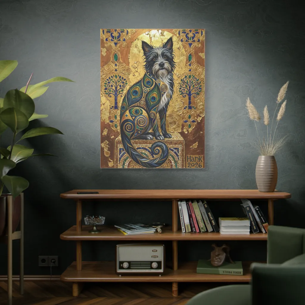 This digital mosaic boldly redefines pet portraiture. Fusing gilded, traditional aesthetics with a contemporary, mystical peacock twist, it's an innovative, experimental elevation. Hank’s quirky regality shines with cutting-edge style.