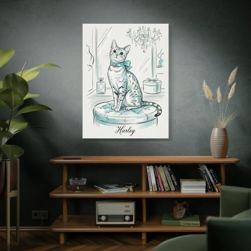"Harley's Teal Reverie" presents a masterful juxtaposition of regal feline form and whimsical brushwork. The tonal harmony in teal evokes a visceral grandeur. Truly an avant-garde triumph, fit for any serious collection.
