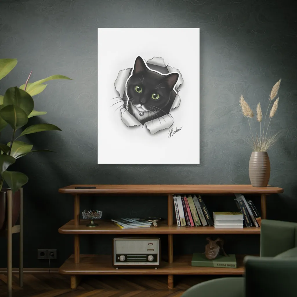 The vibrant, high-saturation blues beautifully complement Harlow's tuxedo, creating a lively, curious energy. A masterclass in chromatic harmony, it perfectly captures her playful spirit and bright gaze. Brilliant!