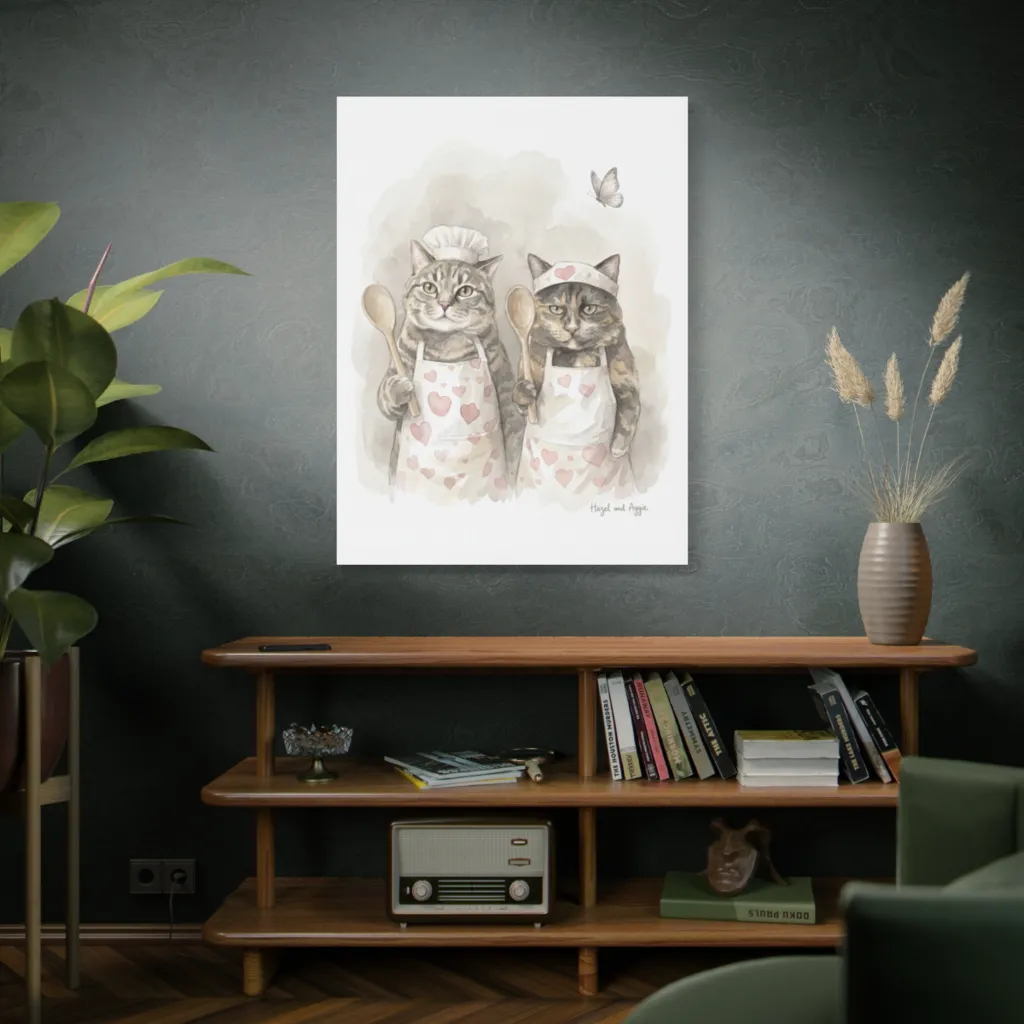 Soft watercolor renders two apron-clad, whiskered bakers looking sweet yet stern, crafting a charmingly whimsical mood.