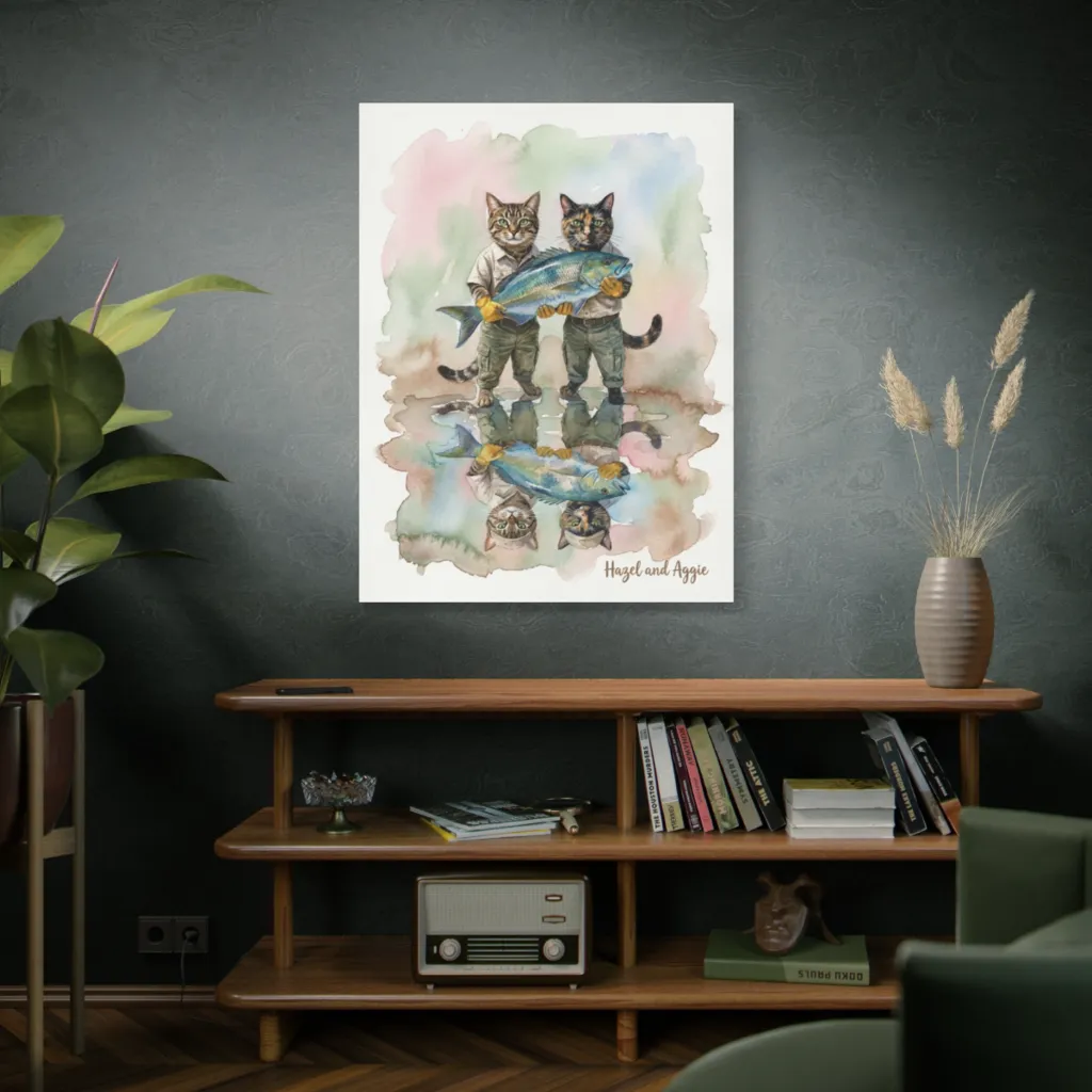 A whimsical watercolor vividly portrays two proud, anthropomorphic cat-fishermen triumphantly displaying their impressive, freshly caught fish and their playful reflections.