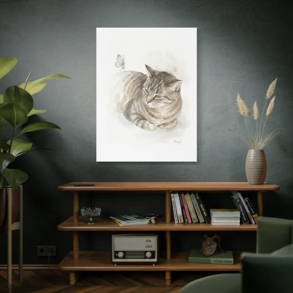 "Hazel's Butterfly Reverie" is a masterclass in captivating composition. The tabby's discerning gaze commands the canvas, echoing Ukiyo-e's elegance, demanding a prime spot in any serious collection.