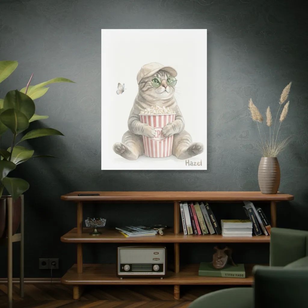 Soft watercolor whimsically renders a cool cat in a cap and glasses, clutching popcorn, observing a butterfly with serene curiosity.