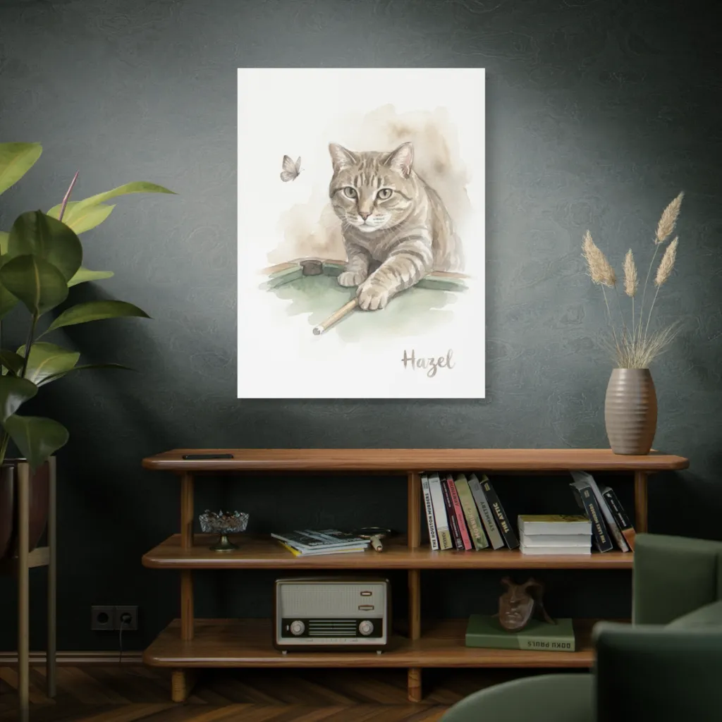 This soft watercolor captures a focused tabby cat on a pool table, cueing up a whimsical and charming moment.