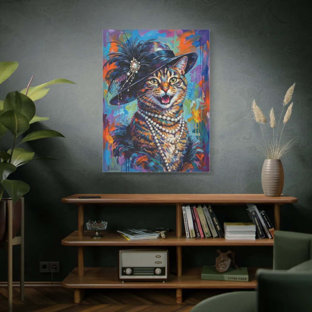 Vibrant impasto textures frame a flamboyant cat in pearls and feathers, exuding theatrical, joyous extravagance.