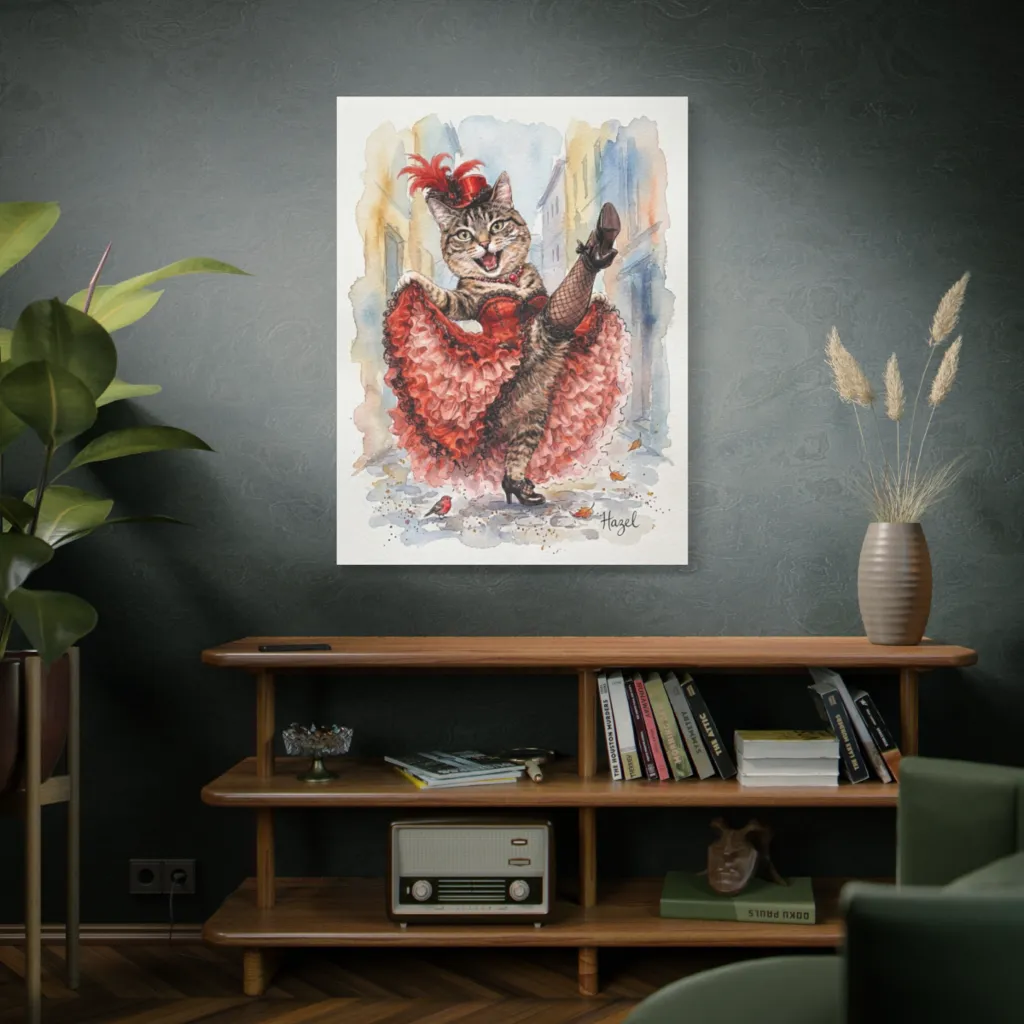 This lively watercolor depicts a joyous tabby kicking up her ruffles in a theatrical can-can, brimming with playful zest. Hazel certainly doesn't miss a beat as she revels in her exuberant feline cabaret.