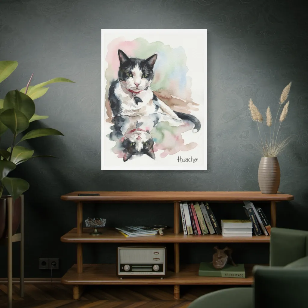 A whimsical watercolor captures a watchful tuxedo cat and its playful reflection, radiating gentle charm. Huacho, the dapper feline, is twice the charm, with his reflection playfully flipping the world on its head.