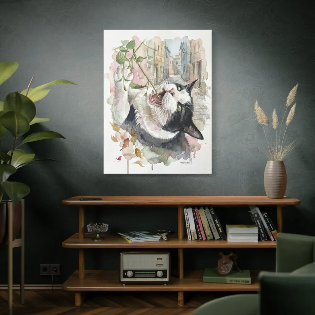 Huacho's Verdant Reverie exhibits masterful tonal harmony; the catnip's visceral joy juxtaposed with an impressionistic dreamscape. A provocative, almost avant-garde triumph for feline portraiture.