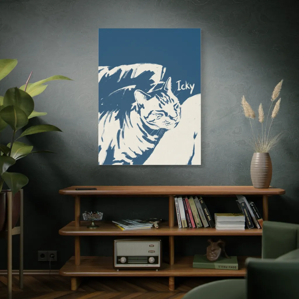 Bold, brushstroke graphic art portrays a serene, napping cat in cream and blue, conveying peaceful, minimalist charm. Far from icky, this cool cat named Icky perfectly embodies tranquil feline chic.