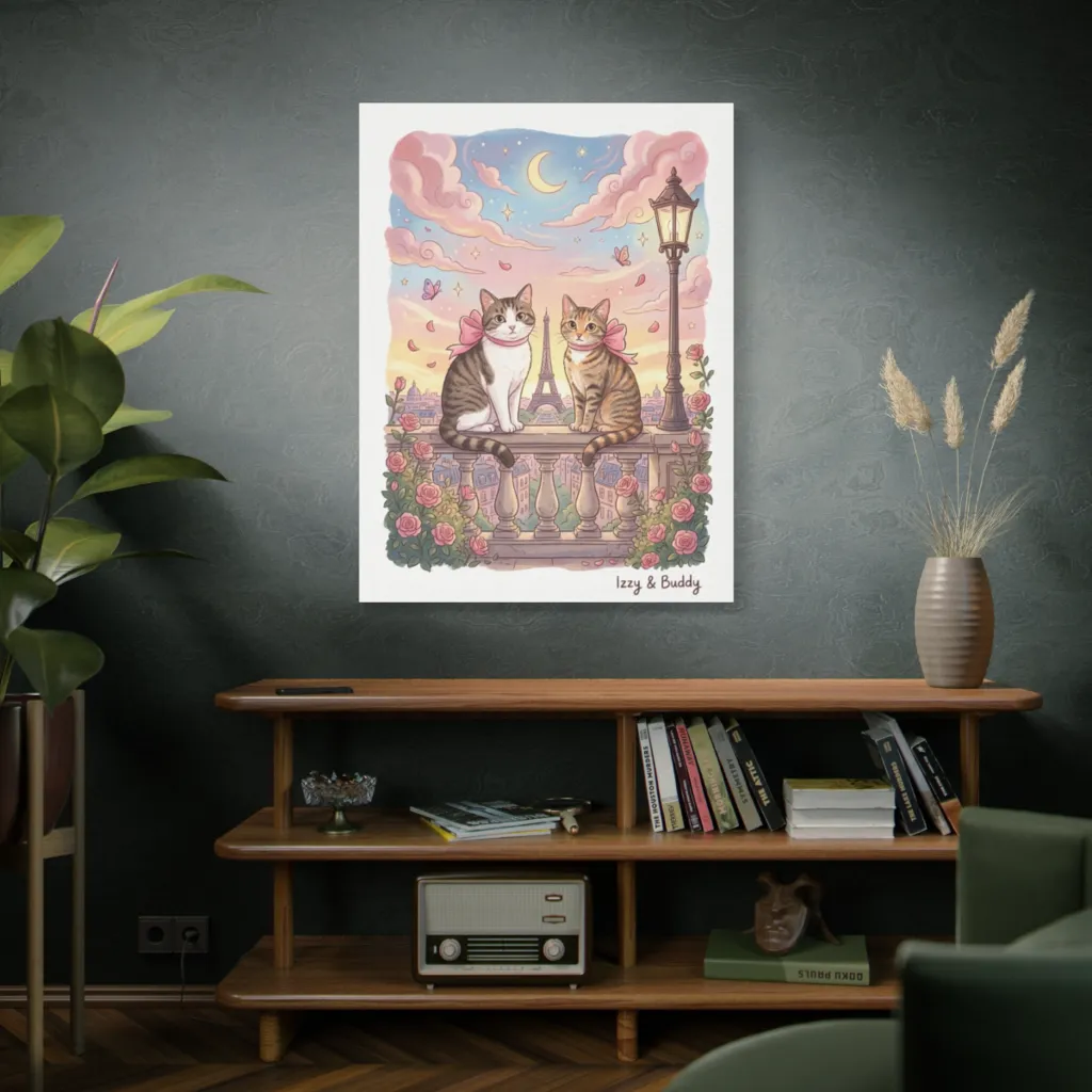 The pastel watercolors create exquisite chromatic harmony, balancing cool twilight blues with warm feline hues. Low saturation evokes a serene, dreamy romance, perfectly capturing Izzy and Buddy's tranquil Parisian reverie. A masterful color composition.