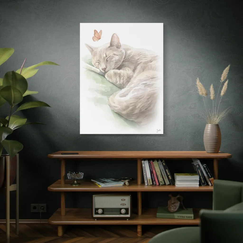 Soft watercolor gently renders a serene, napping cat and a butterfly, evoking a peaceful, dreamy slumber.