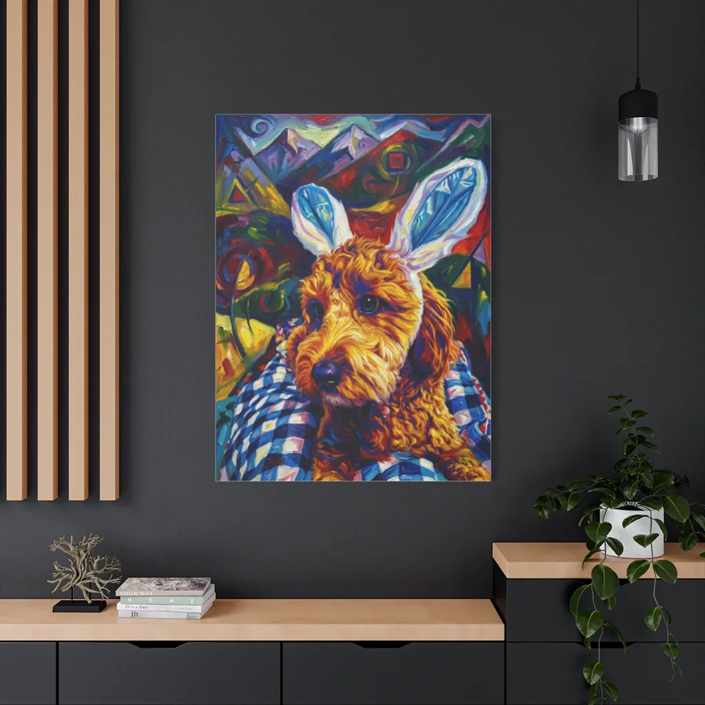 Bold, expressionistic strokes and electric hues bring a whimsical dog in bunny ears to life against abstract mountains, radiating vibrant joy.
