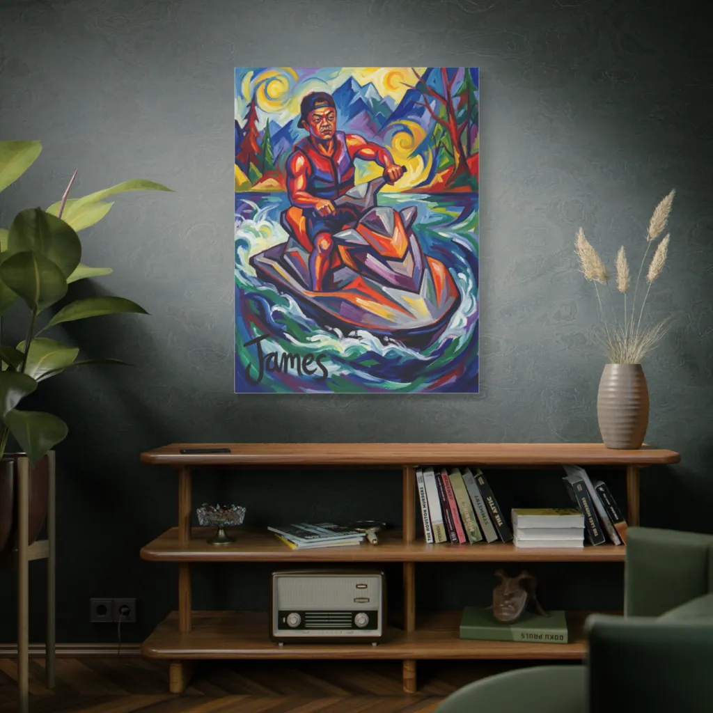 This vibrant, cubist-expressionist explosion of color captures a determined jet skier amidst swirling waters and intense mountain energy. With his name literally making waves, James confidently pilots his jet ski through this wildly colorful, dynamic aquatic adventure.