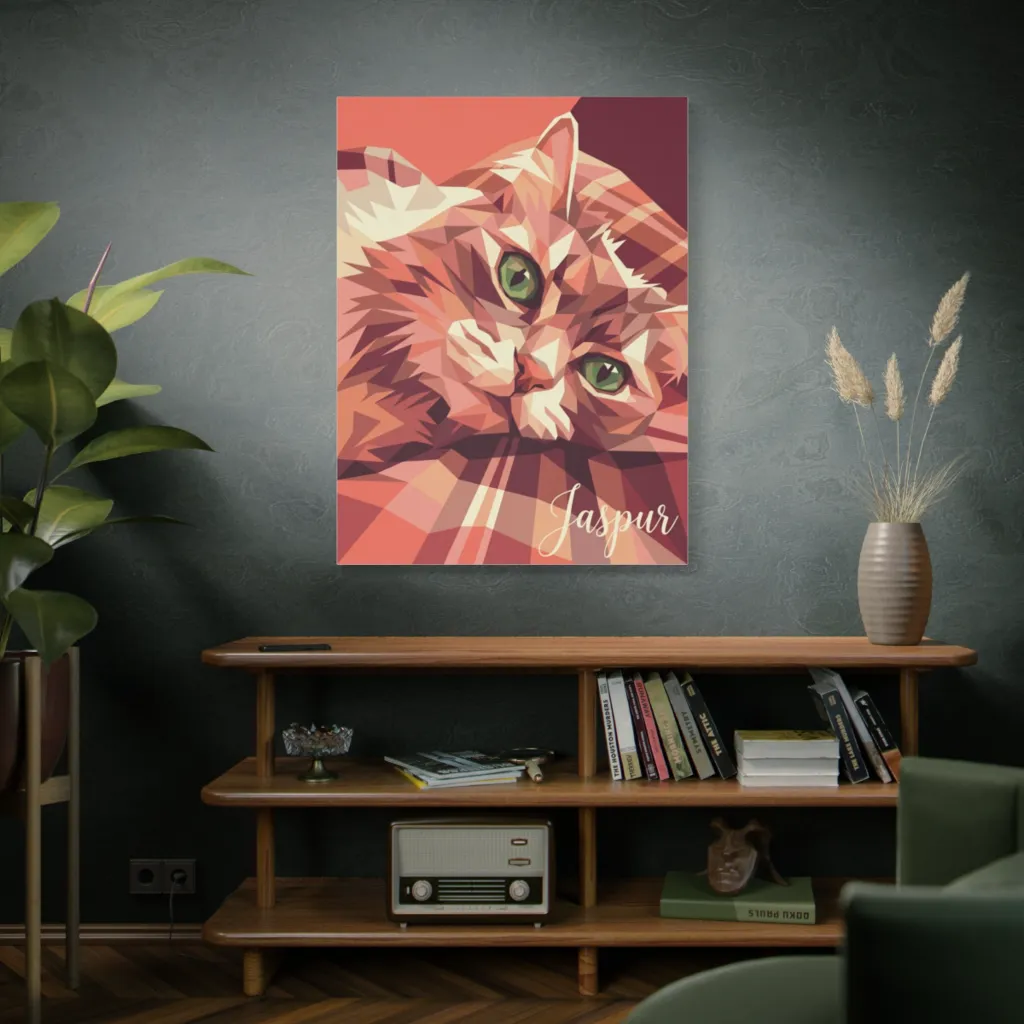 This vibrant, low-poly portrait captures a lounging cat's serene gaze and warm, geometric charm. Jaspur’s multifaceted eyes suggest he’s plotting world domination, or perhaps just another nap.