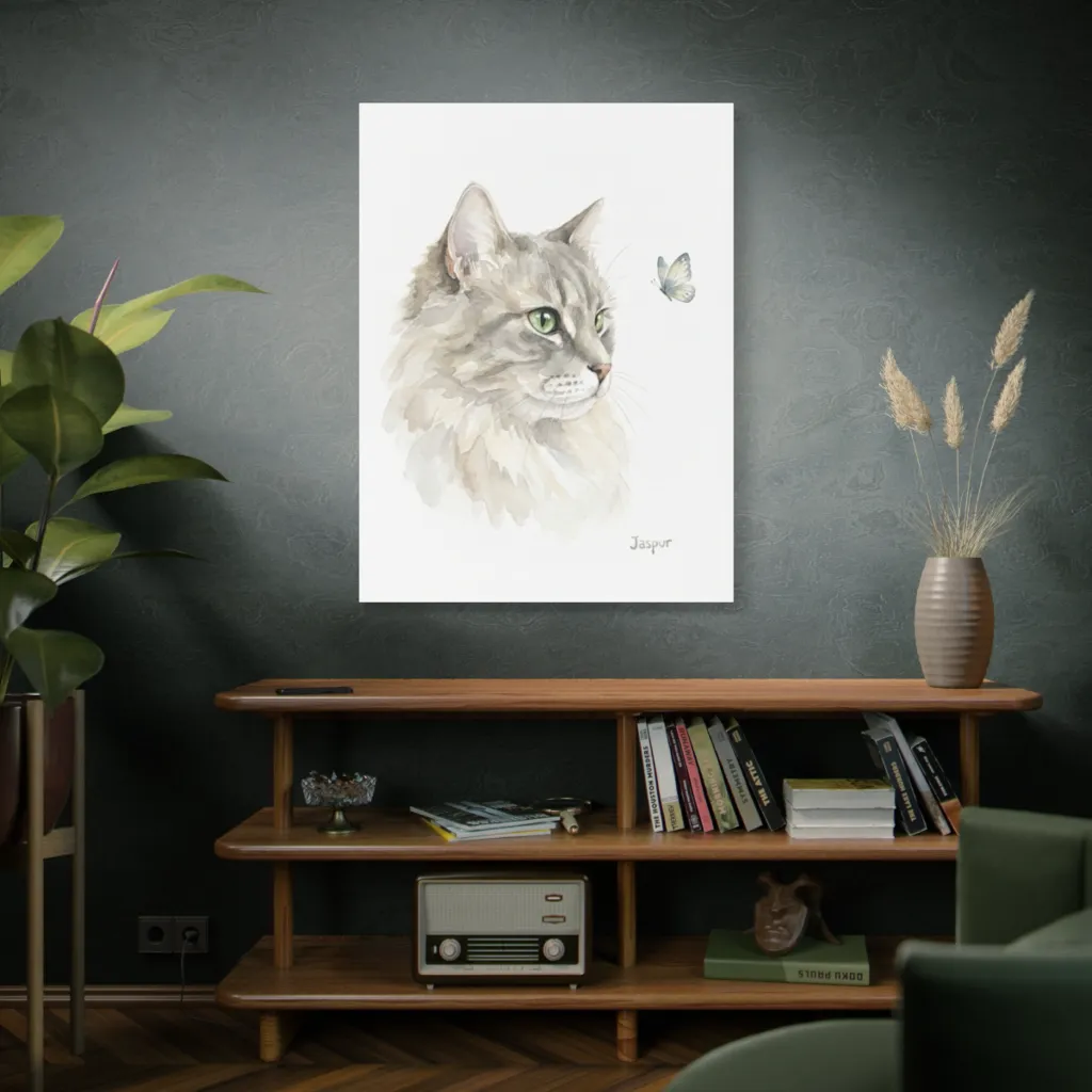 This piece brilliantly fuses traditional watercolor with a contemporary, almost digital aesthetic. Jaspur's innovative, dreamlike portrait reimagines pet art, pushing boundaries between classic sensibility and modern, evocative immersion.