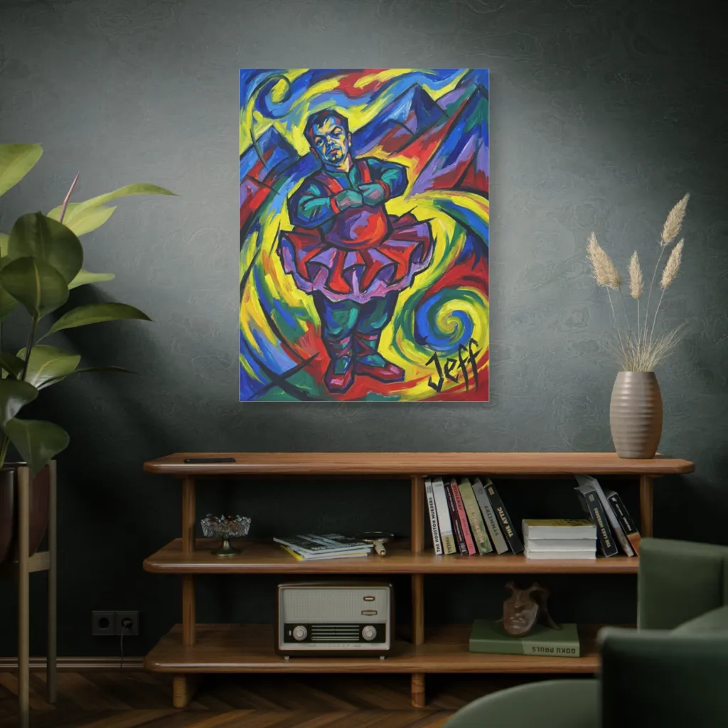A cubist-expressionist dancer in a tutu, with mountains swirling in bold colors, strikes a defiantly playful pose. Meet Jeff, the defiant mountain man, rocking a vibrant tutu in a swirling, expressionistic burst of color.