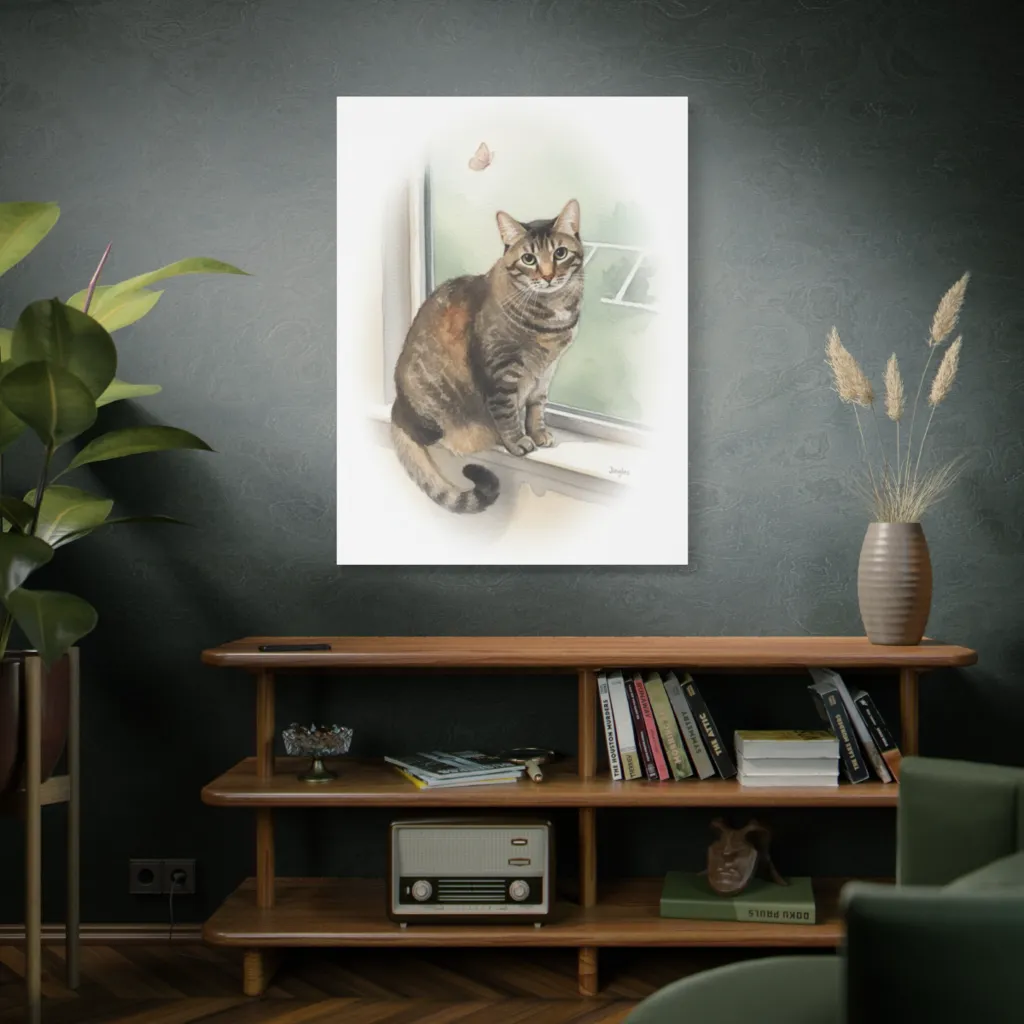 Jingles' watchful gaze and poised stance beautifully capture her observant, gentle soul. The delicate watercolors perfectly reveal her curious, serene feline identity, making her truly special.