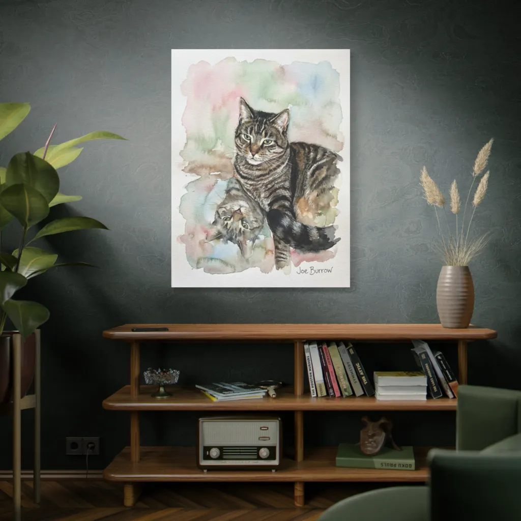 This piece brilliantly merges watercolor's organic fluidity with digital precision, reimagining traditional pet portraiture. The inverted cat is a bold, playful intervention, showcasing an innovative contemporary aesthetic.