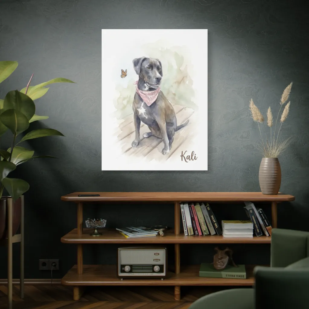 This fluid watercolor masterfully redefines traditional pet portraiture. Kali’s contemplative spirit, digitally enhanced by innovative brushwork, showcases a compelling blend of classic charm and contemporary aesthetic.