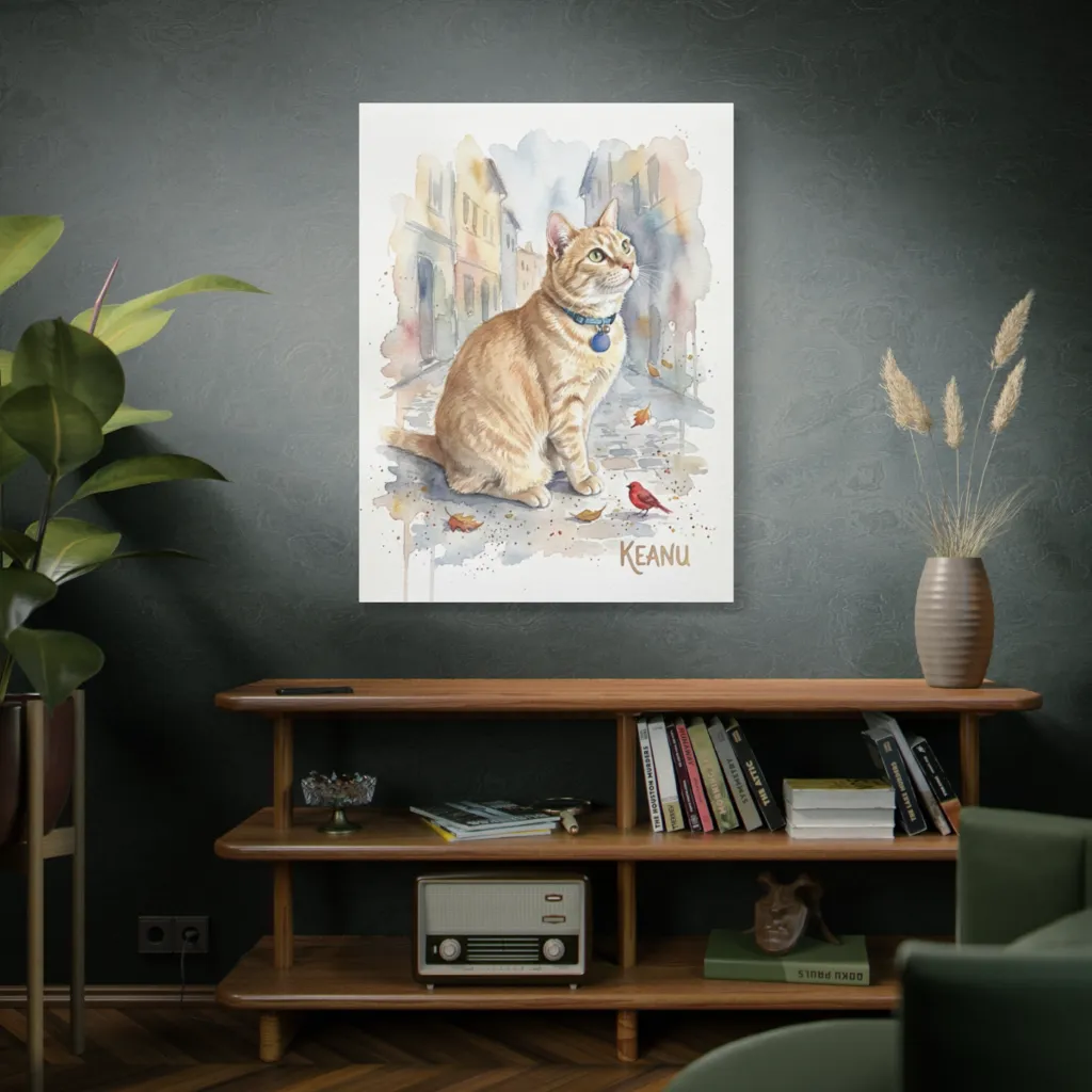 A charming watercolor of a curious orange tabby on an autumnal cobblestone street evokes a peaceful, whimsical daydream. This observant ginger cat, Keanu, is clearly pondering something profoundly excellent, perhaps even "whoa"-worthy.