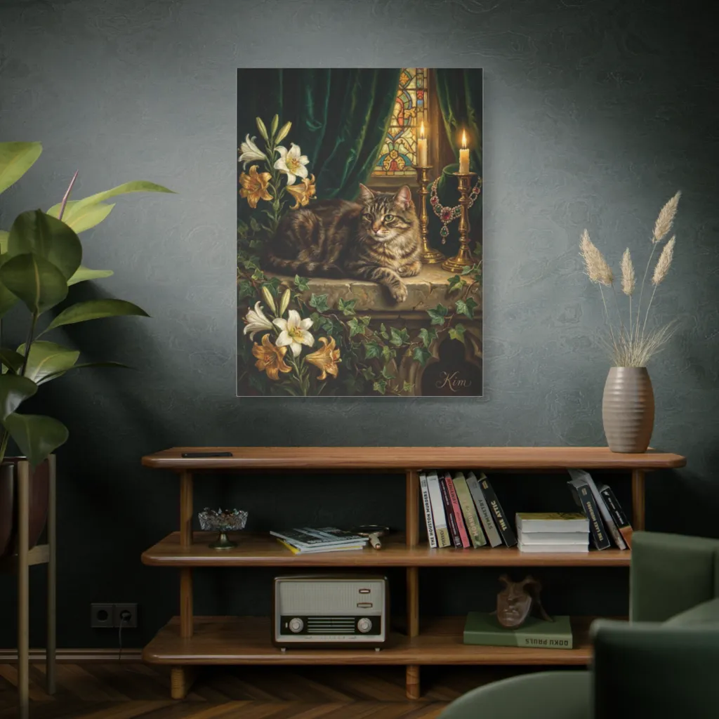 Sumptuously detailed, this painting shows a regal tabby cat presiding over a candlelit, gothic tableau of lilies and jewels.