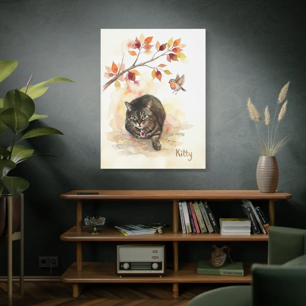 This vibrant watercolor captures a focused tabby and brave robin under whimsical autumn leaves, brimming with quiet tension. Kitty's emerald gaze keenly follows the unsuspecting robin, perhaps dreaming of a feathery appetizer.