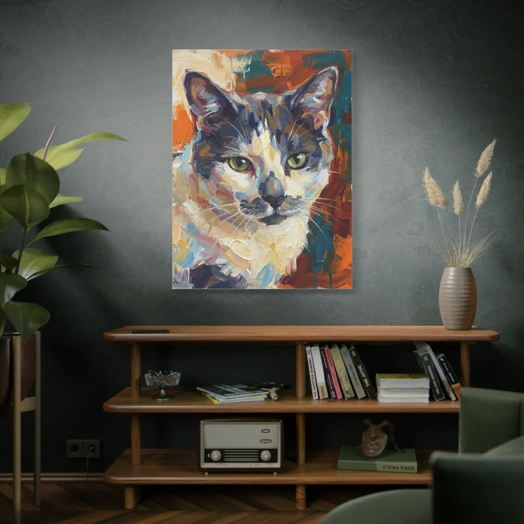 “Kitty's Verdant Gaze” is divine. Imagine it above a raw oak console in a sun-drenched reading nook, complemented by brushed brass and lush velvet. Its playful vibrancy creates a truly chic and dynamic focal point.