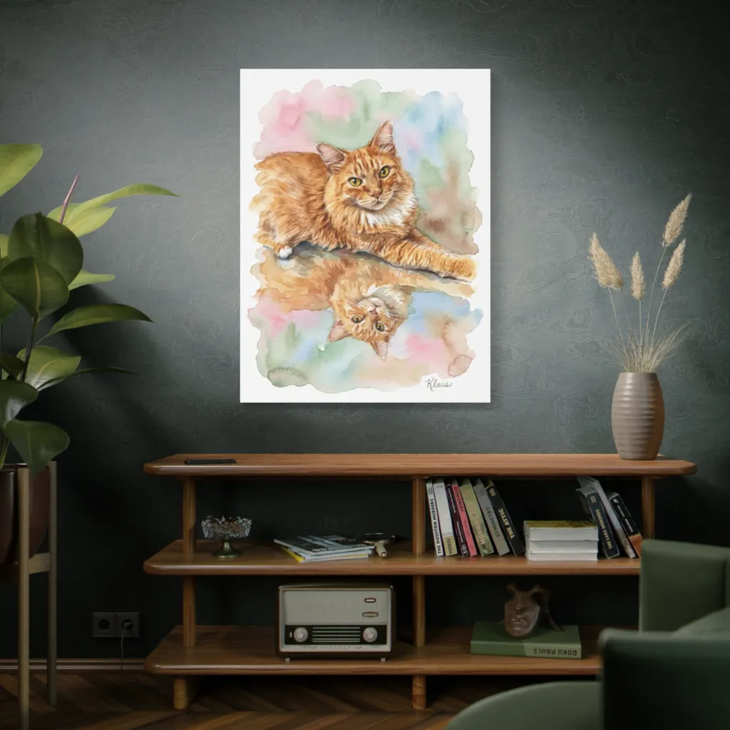 The audacious juxtaposition of Klaus's fluffy repose against his aqueous doppelgänger offers a masterclass in tonal harmony. A visceral study in feline narcissism, rendered with evocative, almost avant-garde brushwork. Profound.