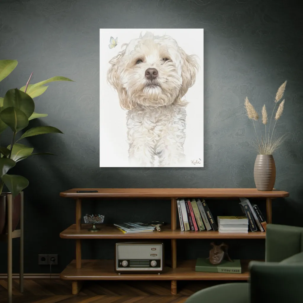 Kobe's gentle curiosity and inherent sweetness radiate from this watercolor. His fluffy form and soft gaze, engaging with the butterfly, perfectly capture his unique, whimsical soul. Truly endearing.