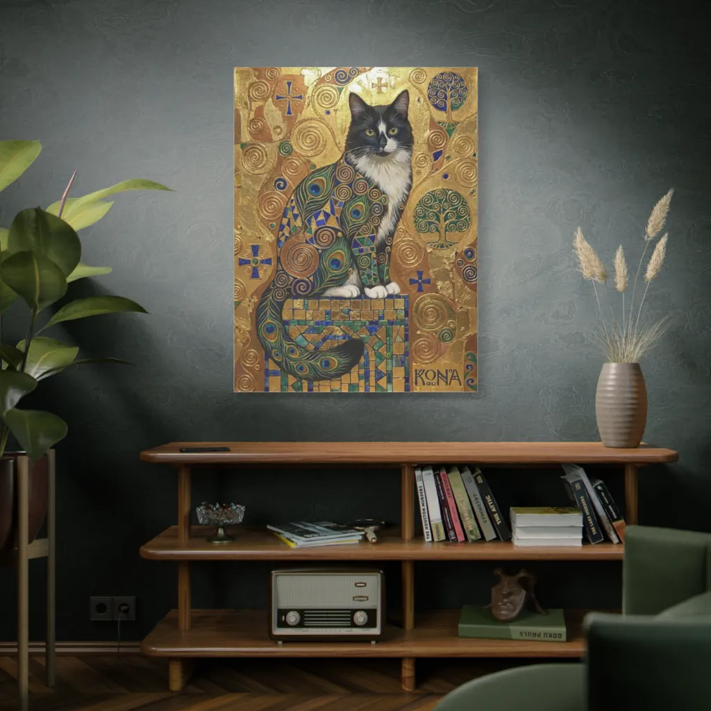 Kona's Art Nouveau splendor establishes an immediate, commanding presence. The mosaic robe, a tour de force, elevates this feline portraiture to exhibition-worthy status, reminiscent of Klimt's opulent canvases. Exquisite.