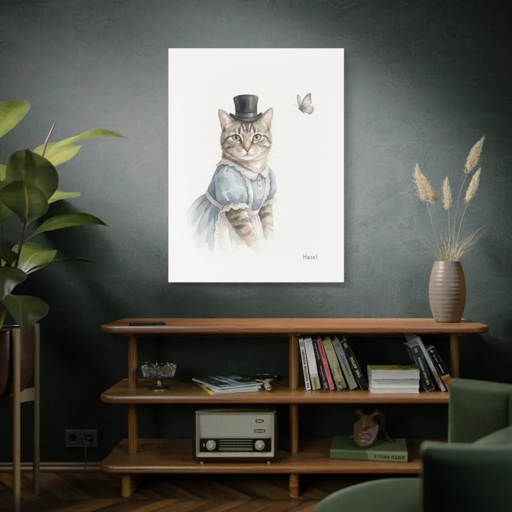 A charming watercolor portrays a prim tabby in a top hat and dress, curiously observing a butterfly with quaint whimsy.