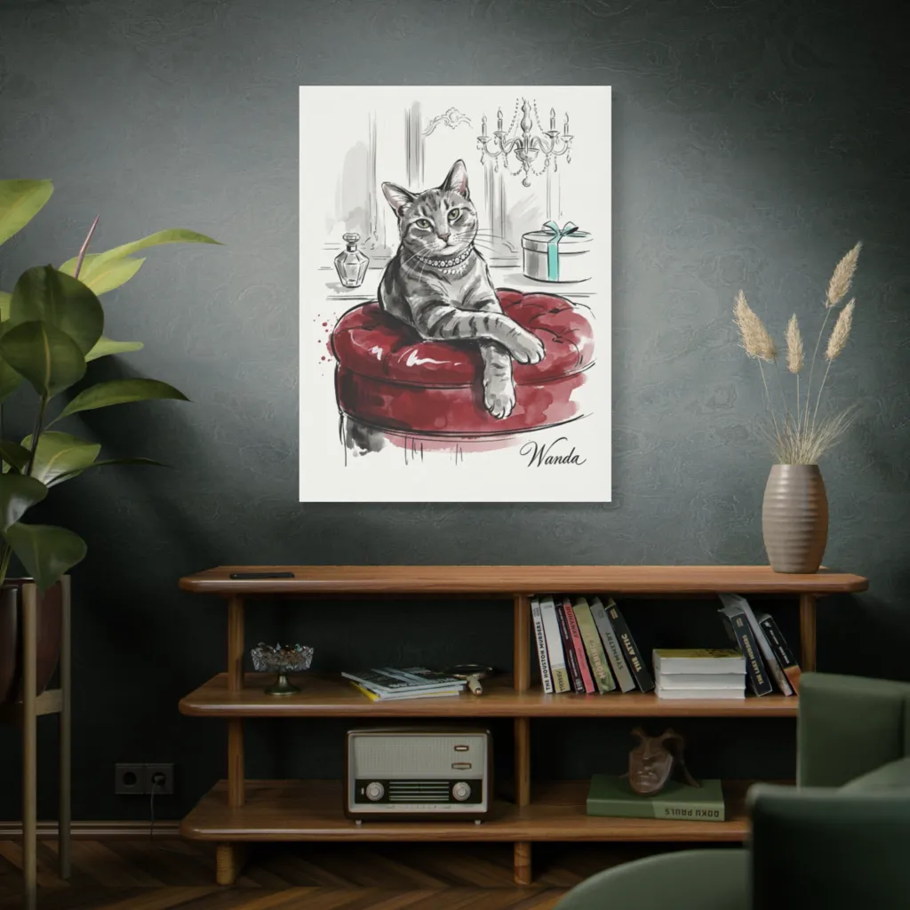 "Lady Wanda's Repose" masterfully juxtaposes the visceral red with Wanda's pearlescent disdain. The delicate brushwork achieves a tonal harmony of pure, avant-garde feline ennui. A truly evocative masterpiece for the ages.