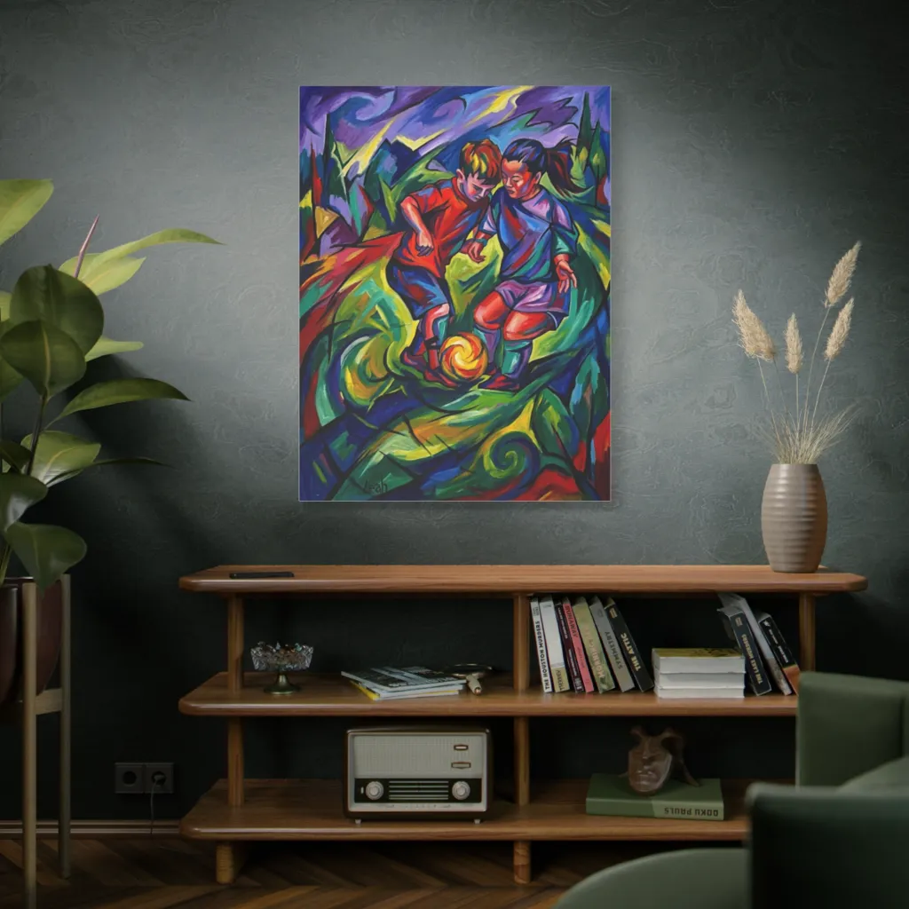 “Leah and the Golden Orb” explodes with vibrant energy! Perfect above a minimalist raw oak console in a playful modern living space. Complement with brushed brass accents and soft linen for a sophisticated, spirited touch.