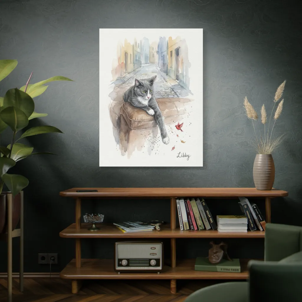 Libby's serene posture and verdant gaze beautifully capture her regal, watchful soul. This watercolor truly reveals her unique diva personality, making her special. A heartwarming portrait.