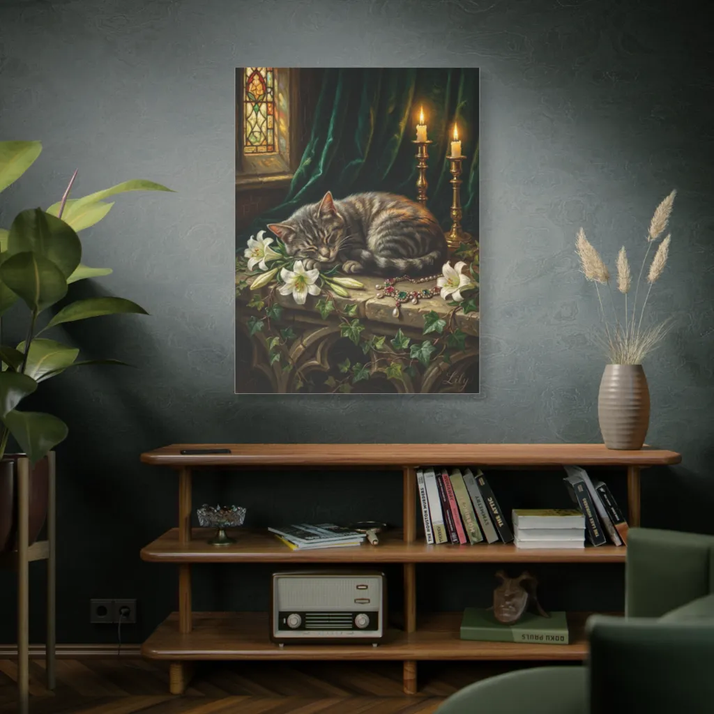 A sumptuously detailed, classical painting captures a tabby cat napping serenely among lilies, jewels, and candlelight in a Gothic interior.