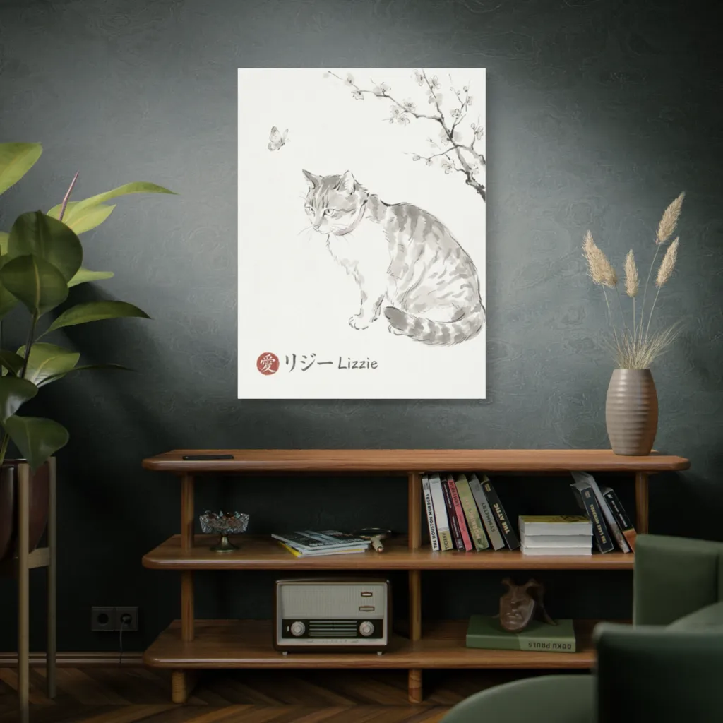 "Lizzie's Blossom Vigil" reveals a sumi-e masterstroke. The delicate brushwork and tonal harmony capture a visceral, avant-garde tension. A feline's existential poise against ephemeral blossoms—pure genius, darling.